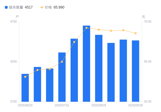 近一年(2024年9月30日至2025年9月30日),菱电电控A股股东户数从3733户,增加至4517户,增幅21.00%,区间股价上涨87.57%。