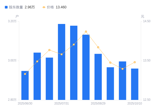 近一年(2024年10月10日至2025年10月10日),宁夏建材A股股东户数从2.89万户,增加至2.96万户,增幅2.45%,区间股价上涨13.87%。