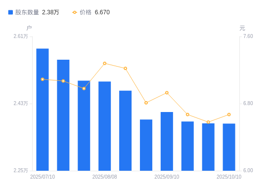 近一年(2024年10月10日至2025年10月10日),天禾股份A股股东户数从3.37万户,减低至2.38万户,降幅29.40%,区间股价上涨20.48%。