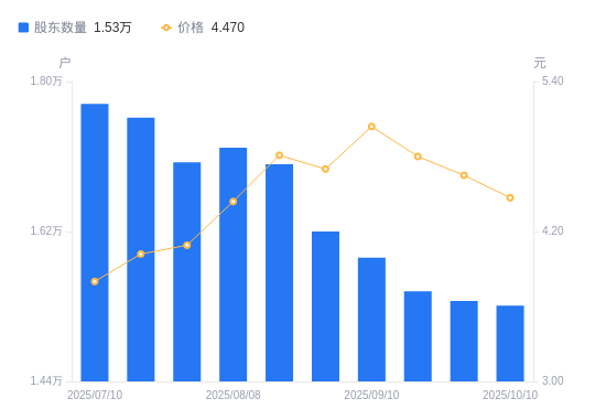 10月9日消息,数据显示,截至2025年9月30日,ST天瑞A股股东总户数为1.54万户,较上期(2025年9月19日)减少115户,降幅0.74%。公司最新A股总股本为4.96亿股,其中流通A股4.21亿股,户均持有流通A股数量为2.74万股,较上期增加203.27股,增幅0.75%;户均持流通A股市值12.73万元,较上期减少3129.19元,降幅2.40%。