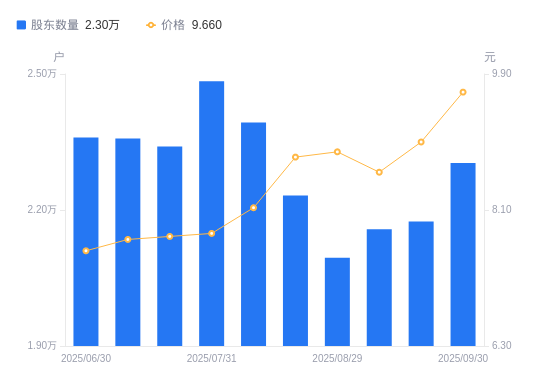 近一年(2024年9月30日至2025年9月30日),中辰股份A股股东户数从2.2万户,增加至2.3万户,增幅4.92%,区间股价上涨58.88%。