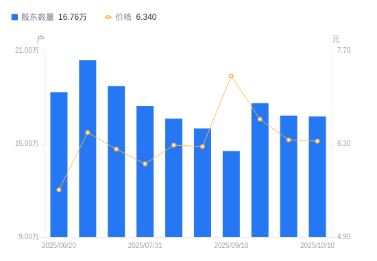 10月15日消息,数据显示,截至2025年10月10日,二六三A股股东总户数为16.76万户,较上期(2025年9月30日)减少637户,降幅0.38%。公司最新A股总股本为13.75亿股,其中流通A股13.67亿股,户均持有流通A股数量为8155.15股,较上期增加30.88股,增幅0.38%;户均持流通A股市值5.17万元,较上期增加33.27元,增幅0.06%。