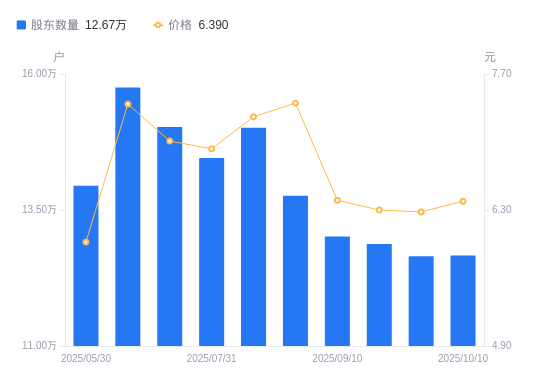 10月15日消息,数据显示,截至2025年10月10日,天海防务A股股东总户数为12.67万户,较上期(2025年9月30日)增加151户,增幅0.12%。公司最新A股总股本为17.28亿股,其中流通A股16.47亿股,户均持有流通A股数量为1.3万股,较上期减少15.52股,降幅0.12%;户均持流通A股市值8.31万元,较上期增加1333.15元,增幅1.63%。