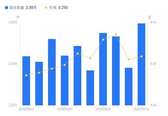 近一年(2024年10月10日至2025年10月10日),冀凯股份A股股东户数从1.6万户,增加至2.99万户,增幅87.48%,区间股价上涨46.21%。