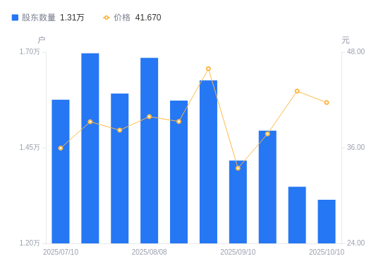 近一年(2024年10月10日至2025年10月10日),航天南湖A股股东户数从1.28万户,增加至1.31万户,增幅2.78%,区间股价上涨143.40%。