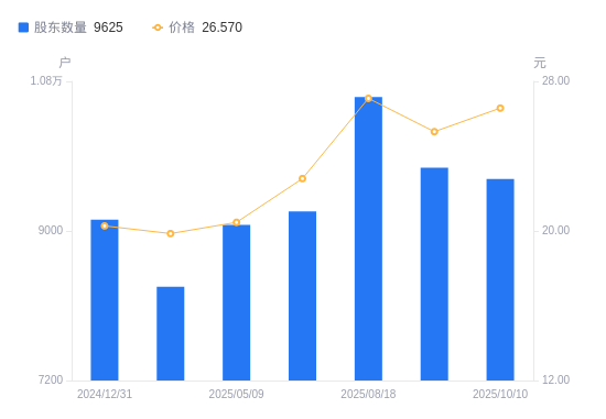 近一年(2024年12月31日至2025年10月10日),科净源A股股东户数从9135户,增加至9625户,增幅5.36%,区间股价上涨28.98%。