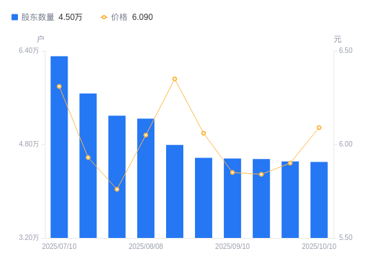 10月16日消息,数据显示,截至2025年10月10日,新联电子A股股东总户数为4.5万户,较上期(2025年9月30日)减少100户,降幅0.22%。公司最新A股总股本为8.34亿股,其中流通A股8.01亿股,户均持有流通A股数量为1.78万股,较上期增加39.48股,增幅0.22%;户均持流通A股市值10.84万元,较上期增加3615.91元,增幅3.45%。