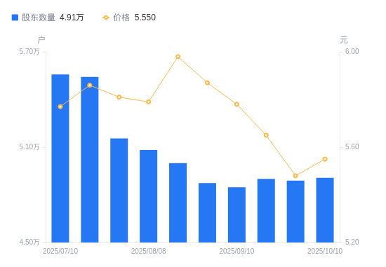 近一年(2024年10月10日至2025年10月10日),安凯客车A股股东户数从6.23万户,减低至4.91万户,降幅21.27%,区间股价上涨12.58%。