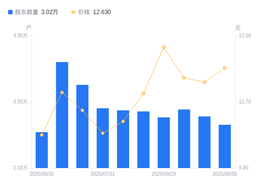 10月16日消息,数据显示,截至2025年9月30日,沃顿科技A股股东总户数为3.02万户,较上期(2025年9月19日)减少1760户,降幅5.51%。公司最新A股总股本为4.73亿股,其中流通A股4.22亿股,户均持有流通A股数量为1.4万股,较上期增加771.2股,增幅5.83%;户均持流通A股市值17.67万元,较上期增加1.49万元,增幅9.21%。