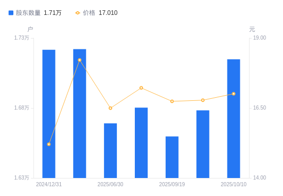 近一年(2024年12月31日至2025年10月10日),旺能环境A股股东户数从1.72万户,减低至1.71万户,降幅0.40%,区间股价上涨9.56%。