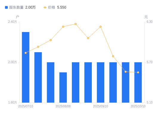 近一年(2024年10月10日至2025年10月10日),中兴商业A股股东户数从2.5万户,减低至2万户,降幅20.00%,区间股价上涨35.37%。