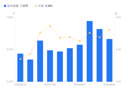 近一年(2024年9月30日至2025年9月30日),软控股份A股股东户数从4.56万户,增加至7万户,增幅53.59%,区间股价上涨21.35%。