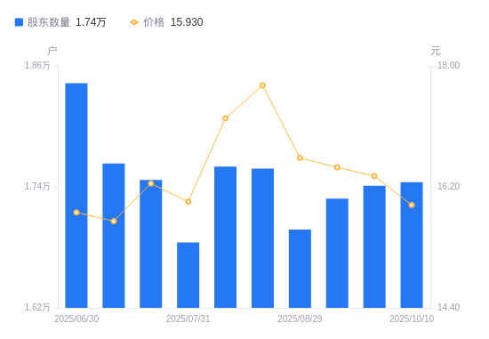 近一年(2024年10月10日至2025年10月10日),同益股份A股股东户数从2.01万户,减低至1.74万户,降幅13.32%,区间股价下跌6.46%。