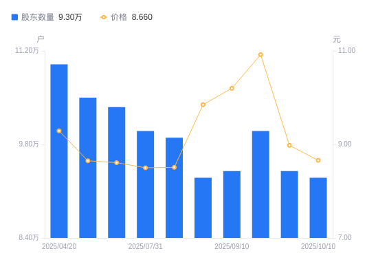 近一年(2024年10月10日至2025年10月10日),西安饮食A股股东户数从10.6万户,减低至9.3万户,降幅12.26%,区间股价上涨9.48%。