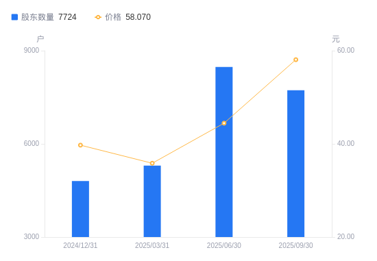 近一年(2024年9月30日至2025年9月30日),开勒股份A股股东户数从3562户,增加至7724户,增幅116.84%,区间股价上涨86.50%。