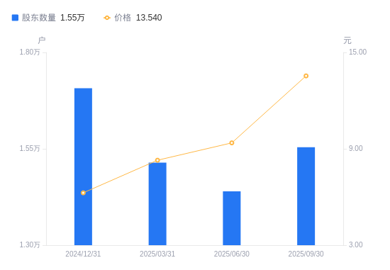 近一年(2024年9月30日至2025年9月30日),集友股份A股股东户数从1.82万户,减低至1.55万户,降幅14.41%,区间股价上涨232.68%。