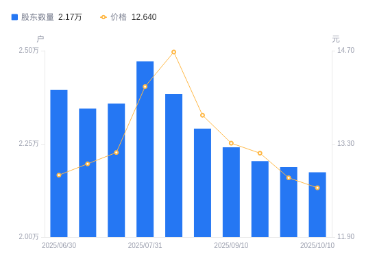 10月20日消息,数据显示,截至2025年10月10日,火星人A股股东总户数为2.17万户,较上期(2025年9月30日)减少140户,降幅0.64%。公司最新A股总股本为4.08亿股,其中流通A股2.94亿股,户均持有流通A股数量为1.35万股,较上期增加86.59股,增幅0.64%;户均持流通A股市值17.1万元,较上期减少921.98元,降幅0.54%。