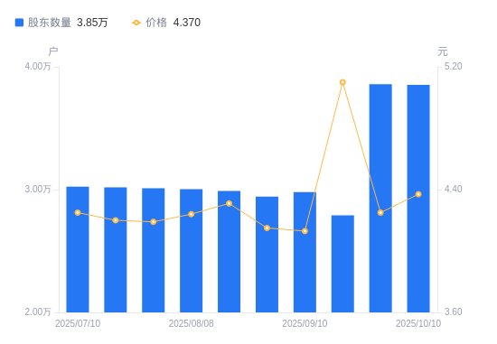 近一年(2024年10月10日至2025年10月10日),公元股份A股股东户数从3.21万户,增加至3.85万户,增幅20.20%,区间股价上涨2.10%。