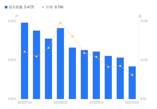 近一年(2024年10月31日至2025年10月20日),银邦股份A股股东户数从9.67万户,减低至5.47万户,降幅43.45%,区间股价下跌50.15%。