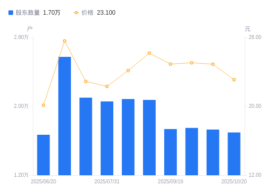 近一年(2024年11月8日至2025年10月20日),中仑新材A股股东户数从2.42万户,减低至1.7万户,降幅29.88%,区间股价上涨2.76%。