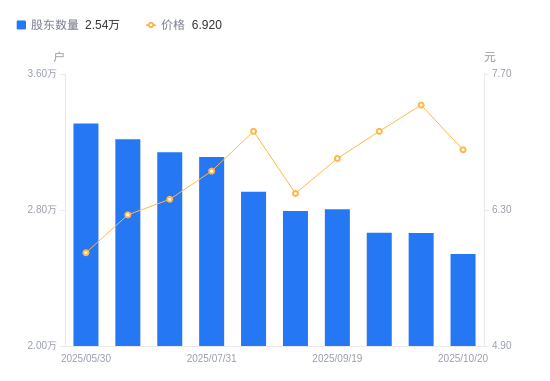 近一年(2024年12月10日至2025年10月20日),润邦股份A股股东户数从3.11万户,减低至2.54万户,降幅18.28%,区间股价上涨29.83%。