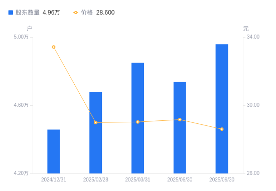 近一年(2024年9月30日至2025年9月30日),国药股份A股股东户数从4.34万户,增加至4.96万户,增幅14.33%,区间股价下跌8.27%。
