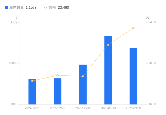 近一年(2024年9月30日至2025年9月30日),海森药业A股股东户数从1.01万户,增加至1.15万户,增幅13.91%,区间股价上涨27.56%。