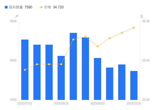 近一年(2024年11月20日至2025年10月20日),洁雅股份A股股东户数从7665户,减低至7580户,降幅1.11%,区间股价上涨68.60%。