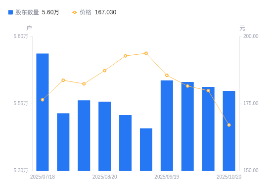 近一年(2024年10月31日至2025年10月20日),爱美客A股股东户数从6.22万户,减低至5.6万户,降幅10.01%,区间股价下跌23.11%。