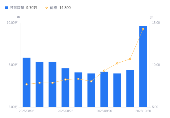 近一年(2024年10月31日至2025年10月20日),海峡股份A股股东户数从3.7万户,增加至9.7万户,增幅162.16%,区间股价上涨151.32%。