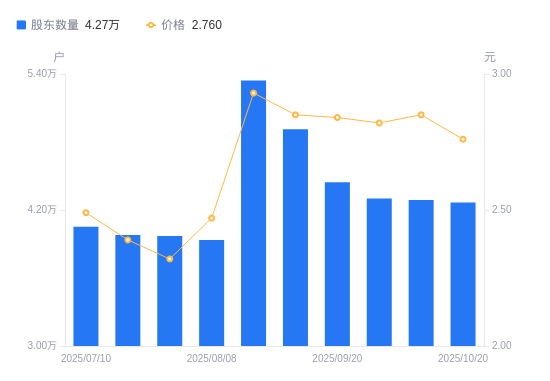 近一年(2024年12月31日至2025年10月20日),康欣新材A股股东户数从4.14万户,增加至4.27万户,增幅2.96%,区间股价上涨30.19%。