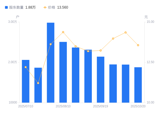 近一年(2024年10月31日至2025年10月20日),国统股份A股股东户数从2.17万户,减低至1.88万户,降幅13.67%,区间股价上涨49.83%。