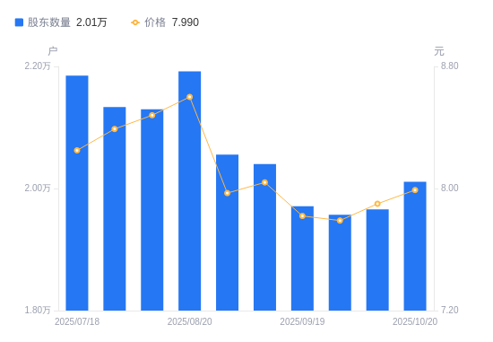 近一年(2024年10月31日至2025年10月20日),益盛药业A股股东户数从2.18万户,减低至2.01万户,降幅7.65%,区间股价上涨17.67%。