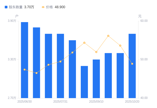 近一年(2024年10月20日至2025年10月20日),浙江鼎力A股股东户数从2.6万户,增加至3.7万户,增幅42.31%,区间股价上涨3.12%。