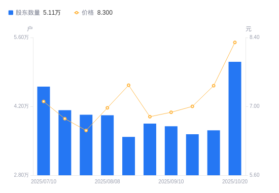 近一年(2024年12月20日至2025年10月20日),东贝集团A股股东户数从2.63万户,增加至5.11万户,增幅94.15%,区间股价上涨63.39%。