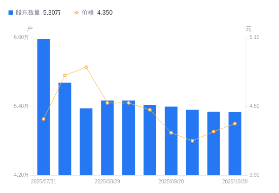 近一年(2024年10月31日至2025年10月20日),悦心健康A股股东户数从5.66万户,减低至5.3万户,降幅6.27%,区间股价上涨23.58%。