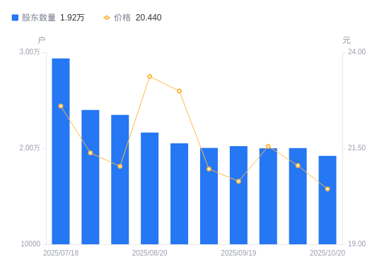 近一年(2024年10月31日至2025年10月20日),瑞达期货A股股东户数从1.88万户,增加至1.92万户,增幅2.21%,区间股价上涨37.83%。