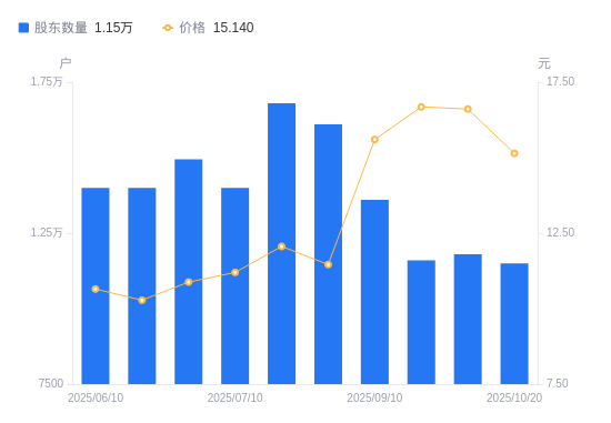 近一年(2024年12月20日至2025年10月20日),康普顿A股股东户数从1.5万户,减低至1.15万户,降幅23.33%,区间股价上涨74.02%。