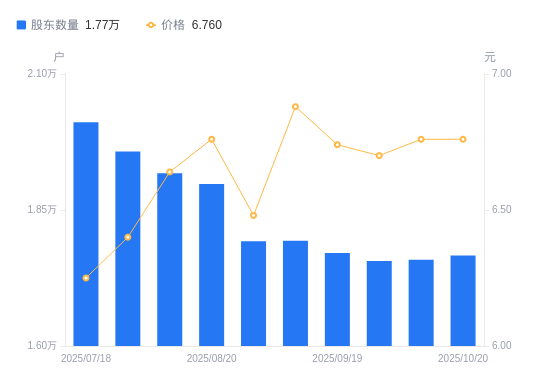 近一年(2024年12月31日至2025年10月20日),龙利得A股股东户数从2.27万户,减低至1.77万户,降幅22.32%,区间股价上涨23.36%。