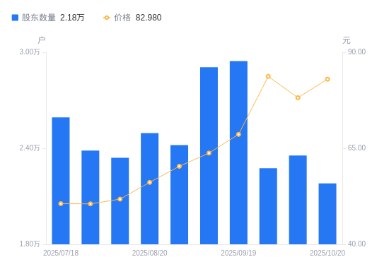 近一年(2024年10月31日至2025年10月20日),尚太科技A股股东户数从1.6万户,增加至2.18万户,增幅36.64%,区间股价上涨37.54%。