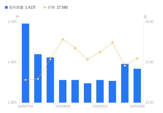 近一年(2024年11月8日至2025年10月20日),图南股份A股股东户数从1.46万户,减低至1.41万户,降幅3.42%,区间股价上涨6.20%。