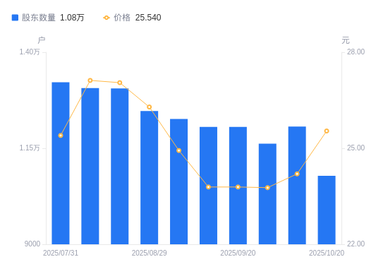 近一年(2024年10月31日至2025年10月20日),聚杰微纤A股股东户数从8683户,增加至1.08万户,增幅24.20%,区间股价上涨109.00%。