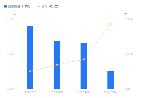 10月22日消息,数据显示,截至2025年9月30日,华兰股份A股股东总户数为1.33万户,较上期(2025年6月30日)减少1999户,降幅13.09%。公司最新A股总股本为1.64亿股,其中流通A股1.57亿股,户均持有流通A股数量为1.18万股,较上期增加3917.12股,增幅49.57%;户均持流通A股市值50.25万元,较上期增加31.12万元,增幅162.64%。