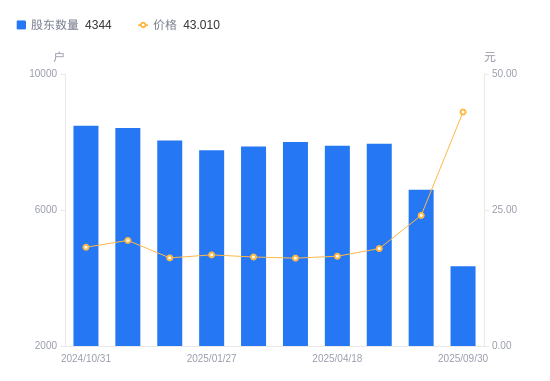 近一年(2024年9月30日至2025年9月30日),森鹰窗业A股股东户数从8676户,减低至4344户,降幅49.93%,区间股价上涨143.68%。