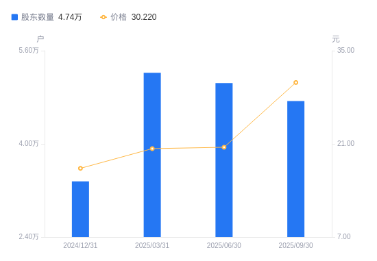 近一年(2024年9月30日至2025年9月30日),江海股份A股股东户数从2.87万户,增加至4.74万户,增幅64.89%,区间股价上涨118.64%。