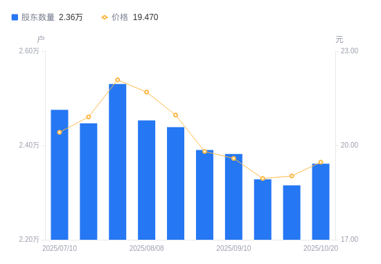 近一年(2024年11月8日至2025年10月20日),明德生物A股股东户数从2.91万户,减低至2.36万户,降幅18.73%,区间股价上涨7.41%。