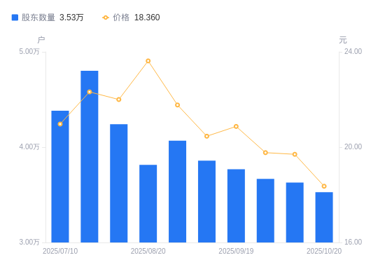 近一年(2024年11月29日至2025年10月20日),酷特智能A股股东户数从4.28万户,减低至3.53万户,降幅17.58%,区间股价下跌3.27%。