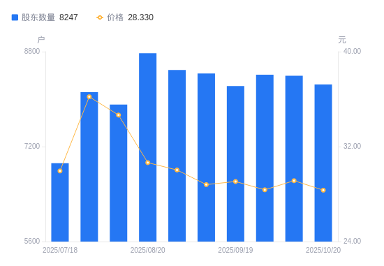 近一年(2024年10月31日至2025年10月20日),久量股份A股股东户数从9379户,减低至8247户,降幅12.07%,区间股价上涨12.42%。