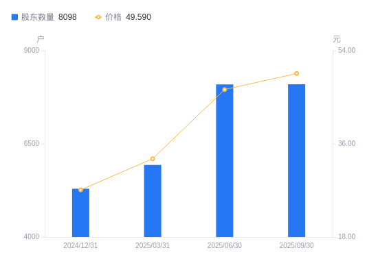 近一年(2024年9月30日至2025年9月30日),伟思医疗A股股东户数从5281户,增加至8098户,增幅53.34%,区间股价上涨102.00%。