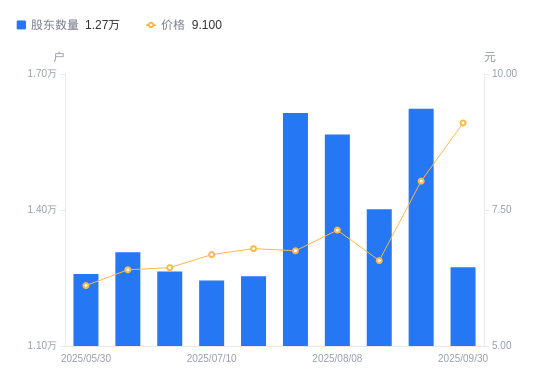 近一年(2024年9月30日至2025年9月30日),延江股份A股股东户数从1.3万户,减低至1.27万户,降幅1.89%,区间股价上涨87.20%。